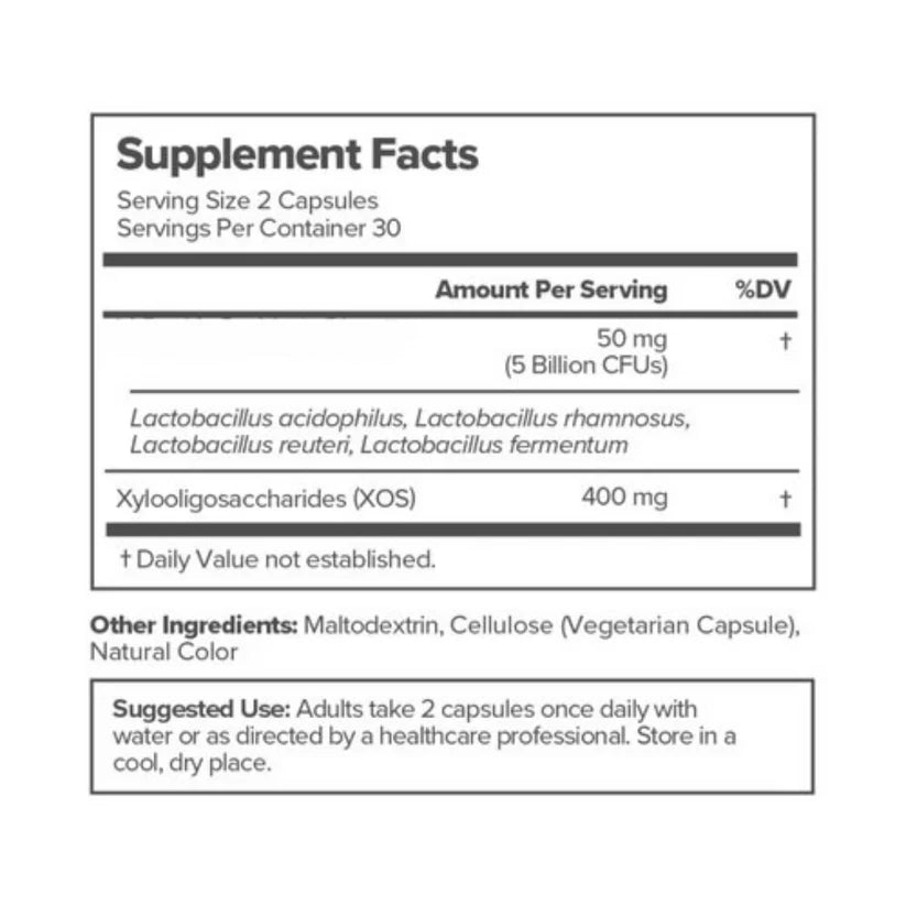Portionsstørrelse: 2 kapsler, 30 portioner pr. pakke. Florabelle Probiotica Blend™: Lactobacillus acidophilus, Lactobacillus rhamnosus, Lactobacillus reuteri, Lactobacillus fermentum 50 mg (5 milliarder CFU'er), Xylooligosaccharider (XOS) 400 mg