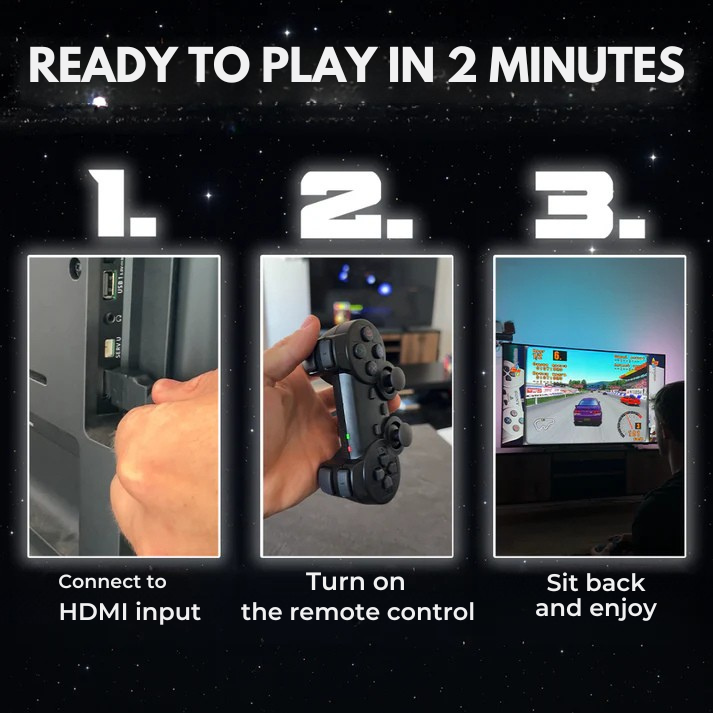Det er plug & play. Tilslut konsollen til HDMI-porten på dit tv, vælg HDMI-indgangen på skærmen og tænd for Infinity G11 Pro. Du er klar til at spille inden for få sekunder – uden ekstra installation.