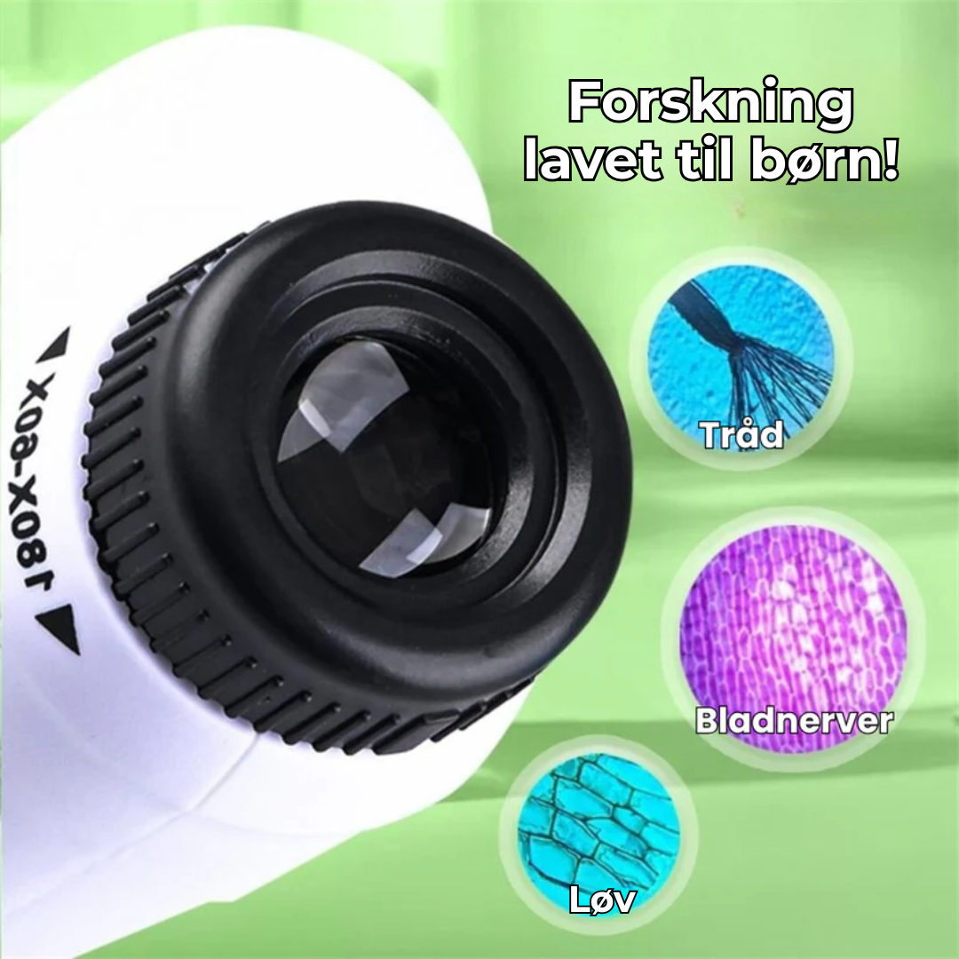 Perfekt til at se på blade, insekter, hår, stof, sand, salt og meget mere. Det afslører en helt ny verden af detaljer – nok til at vække nysgerrighed, uden at det bliver kompliceret.